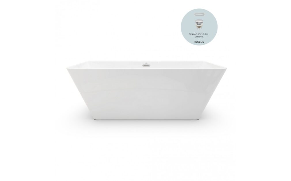 - Drain et trop plein en chrome inclus, situés au centre du bain